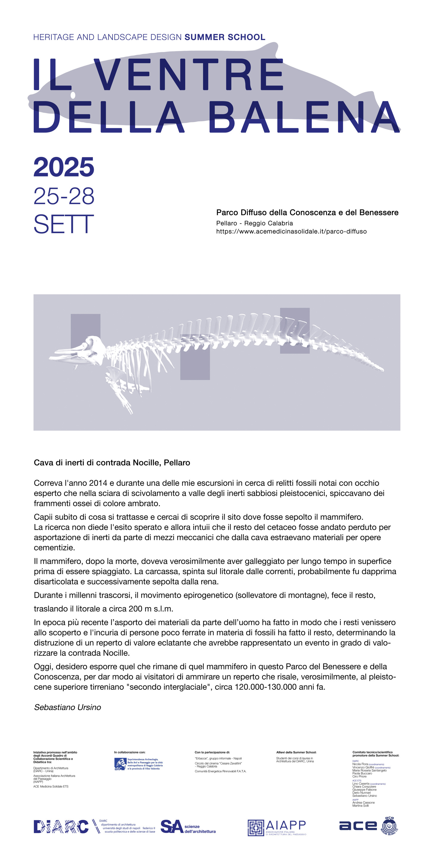 Dal 25 al 28 settembre 2025, nell’ambito degli Accordi Quadro di collaborazione Scientifica e Didattica stipulati tra il Dipartimento di Architettura della Federico II di Napoli (DiARC), l’Associazione Italiana di Architettura del Paesaggio (AIAPP) e l’Associazione di Medicina Solidale (ACE ETS), in collaborazione con la Soprintendenza Archeologia, Belle Arti, Paesaggio per la Città Metropolitana di Reggio Calabria e la provincia di Vibo Valentia e con la partecipazione delle Erbacce, gruppo informale di Napoli, Circolo del cinema Cesare Zavattini di Reggio Calabria e Comunità Energetica Rinnovabili FATA Arghillà, si è svolta, presso il Parco Diffuso della Conoscenza e del Benessere di Reggio Calabria, la Summer School “Il ventre della balena”. Nel corso delle tre giornate sono state svolte attività di cantiere creativo per la realizzazione di un dispositivo narrativo e percettivo, e del suo giardino, per l'esposizione di fossili di balena ritrovati a Pellaro (RC) da Sebastiano Ursino, esplorazioni ecologiche collettive nel Parco e nei suoi dintorni, la visita al Polo sanitario di Arghillà, proiezioni di film, pranzi e cene conviviali.